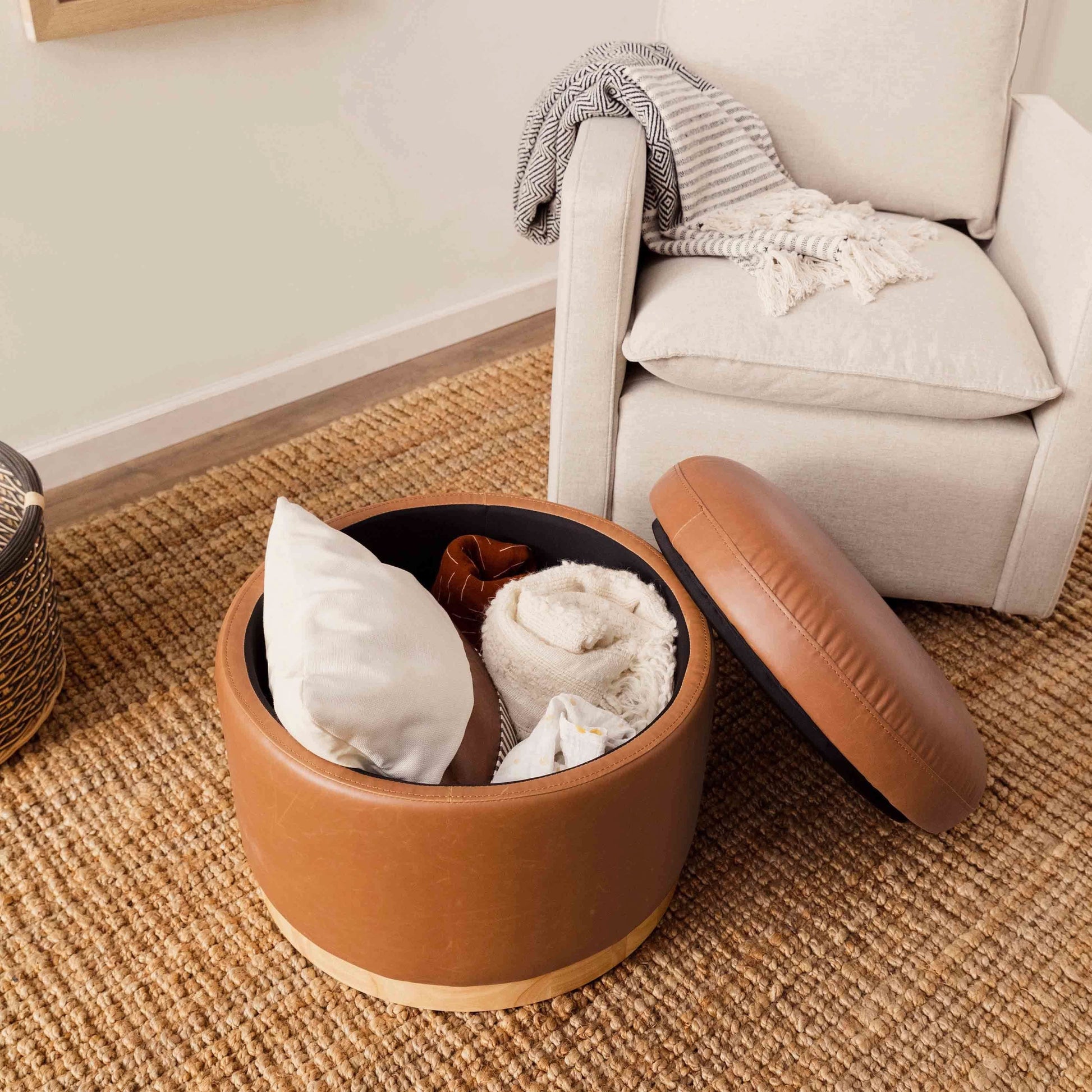 - AMPLE STORAGE: This ottoman is equal parts style and function with its light wood base and storage space for all those extra blankets and toys.