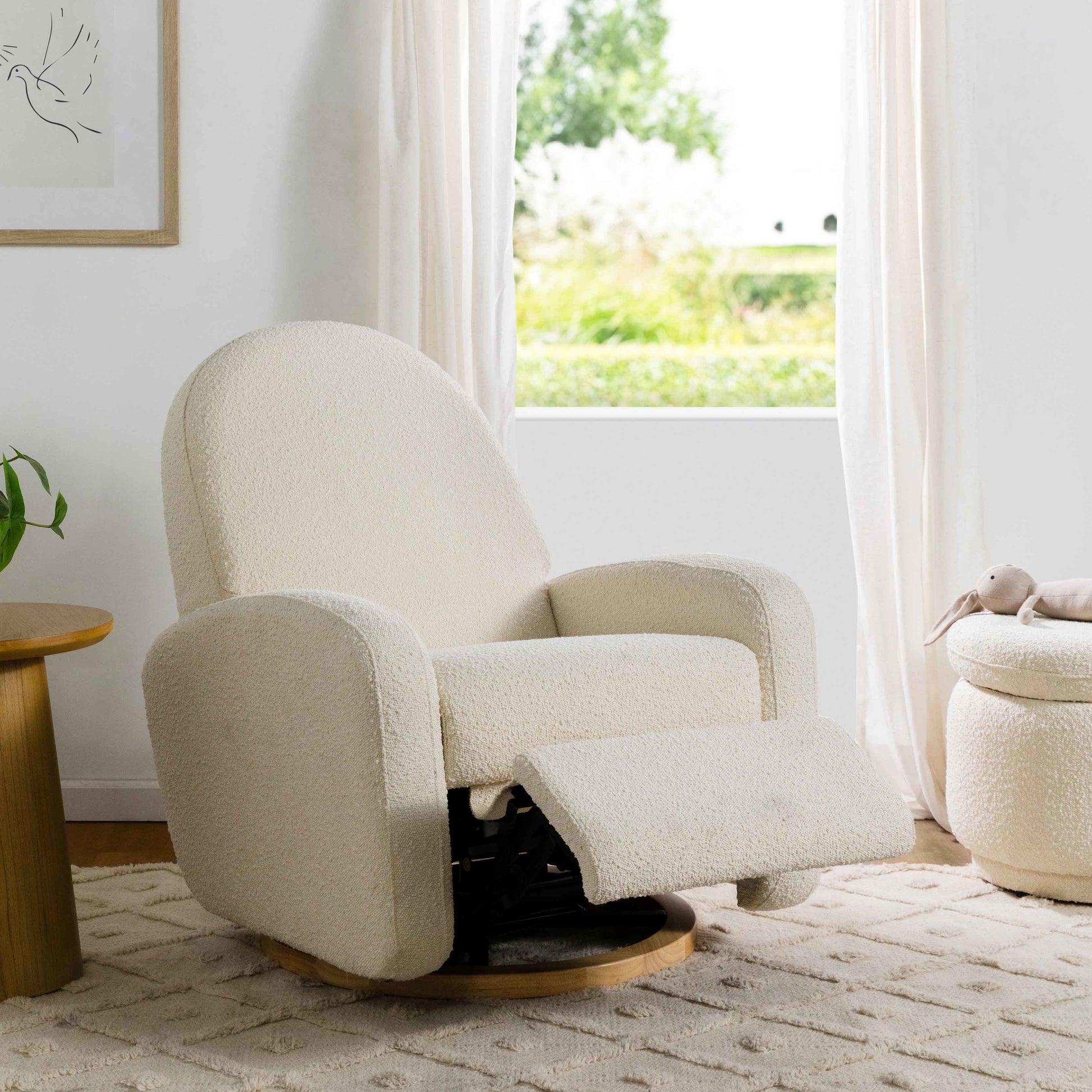 The Nami Glider Recliner is an elevated nursery accent piece thatѓ??s both playful and comfortable with its round and friendly silhouette. The oversized, organic proportions, coupled with its natural wood base, fit into a soft and modern palette. Rest and recharge in this recliner with its built-in USB port, smooth swivel motion, and effortless back and forth gliding. Lean back and relax at the touch of a button with this recliner's quiet electronic control button. Pair with Naka or Enoki Storage Ottoman to complete the look.