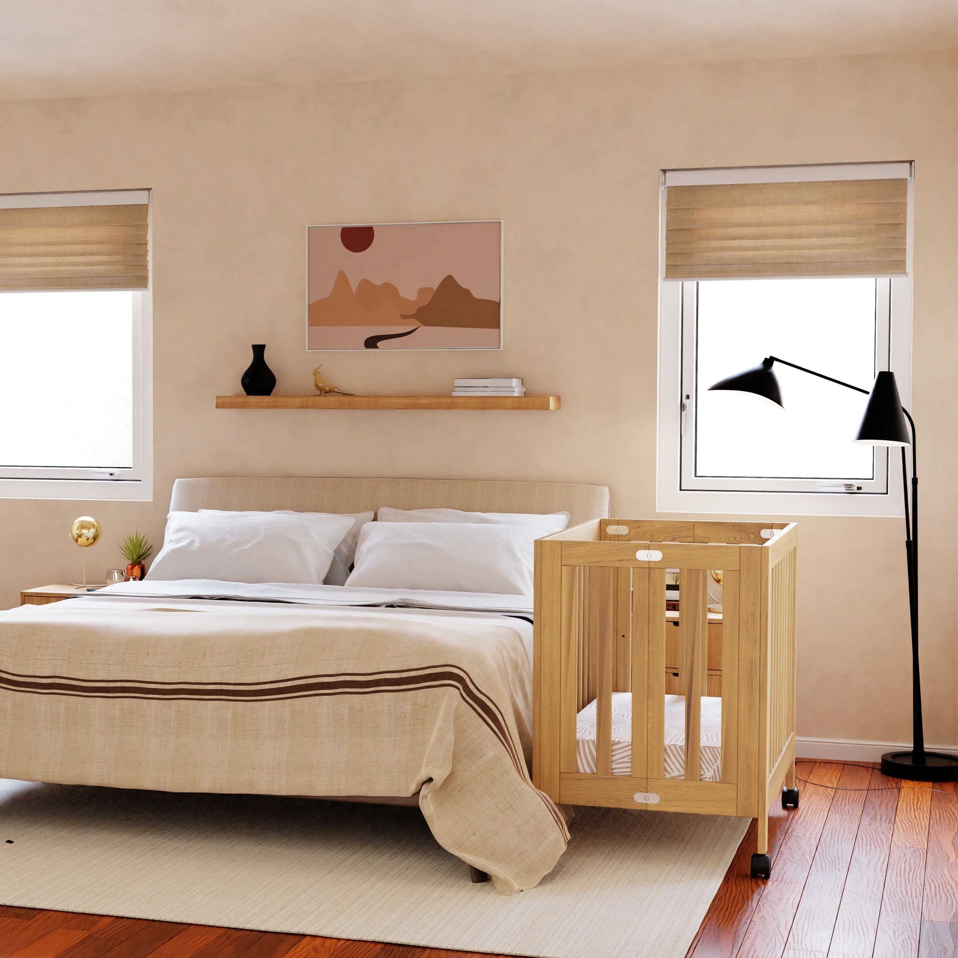 Meet Origami Mini Crib, the portable mini crib designed for modern families. Perfect for urban living or secondary living spaces, the Origami Mini's petite footprint and rolling feet allow for easy movement throughout the home, and will outlast a bassinet, providing a safe sleeping environment for your growing babe. With a folding mechanism for storage, the sustainable wood construction of the Origami Mini is both durable and lightweight.