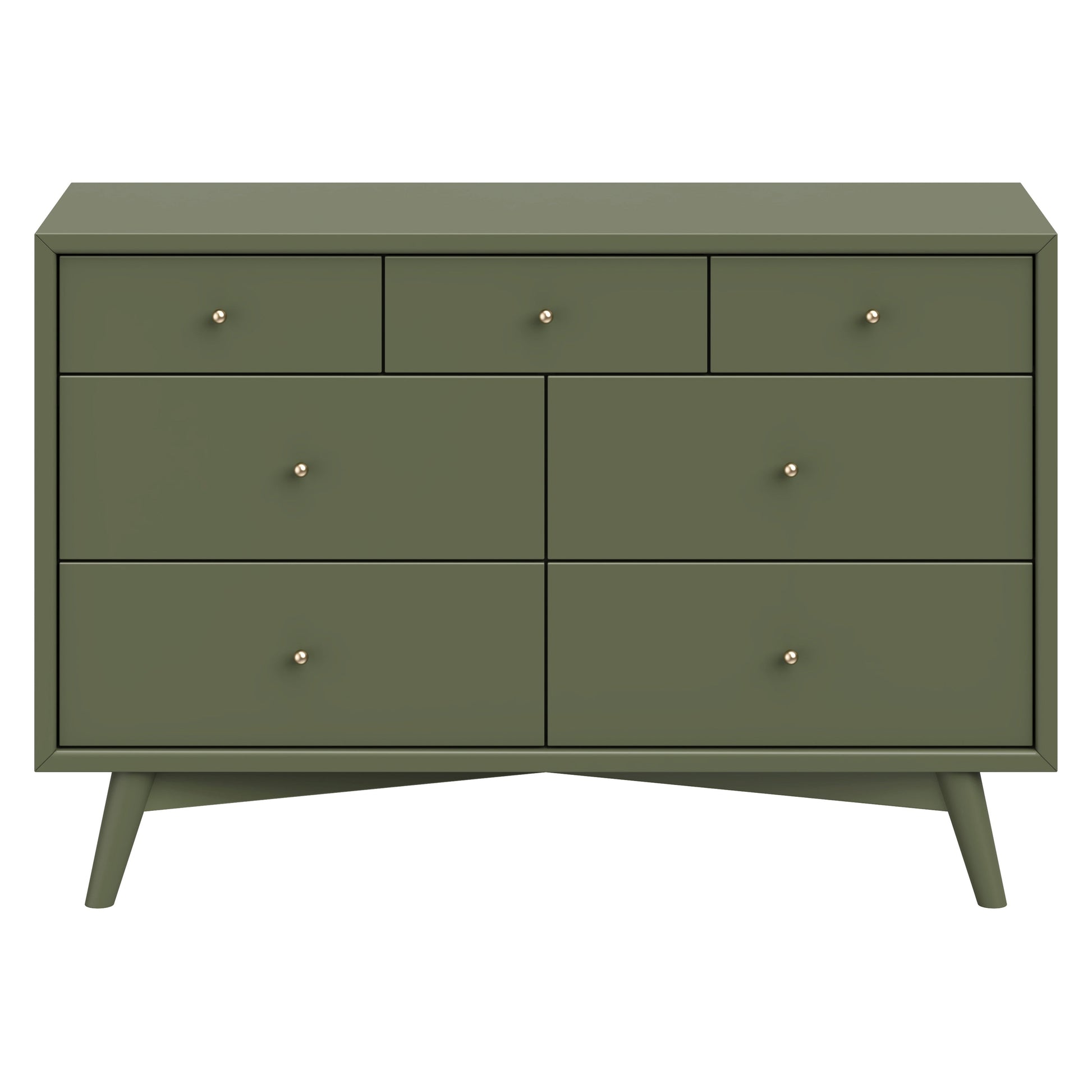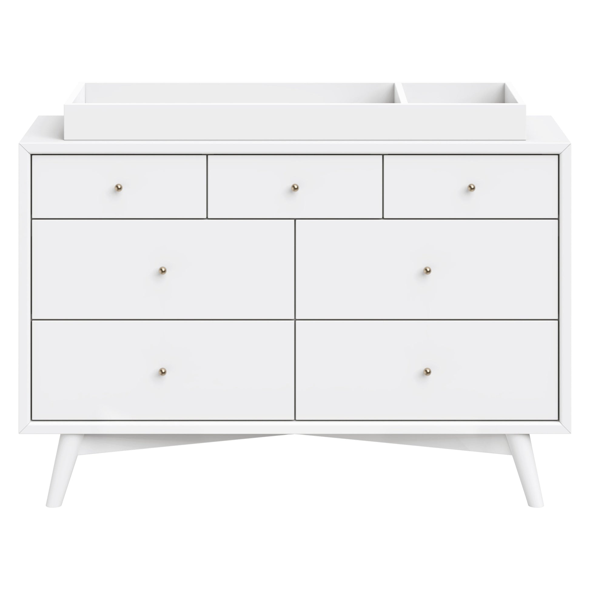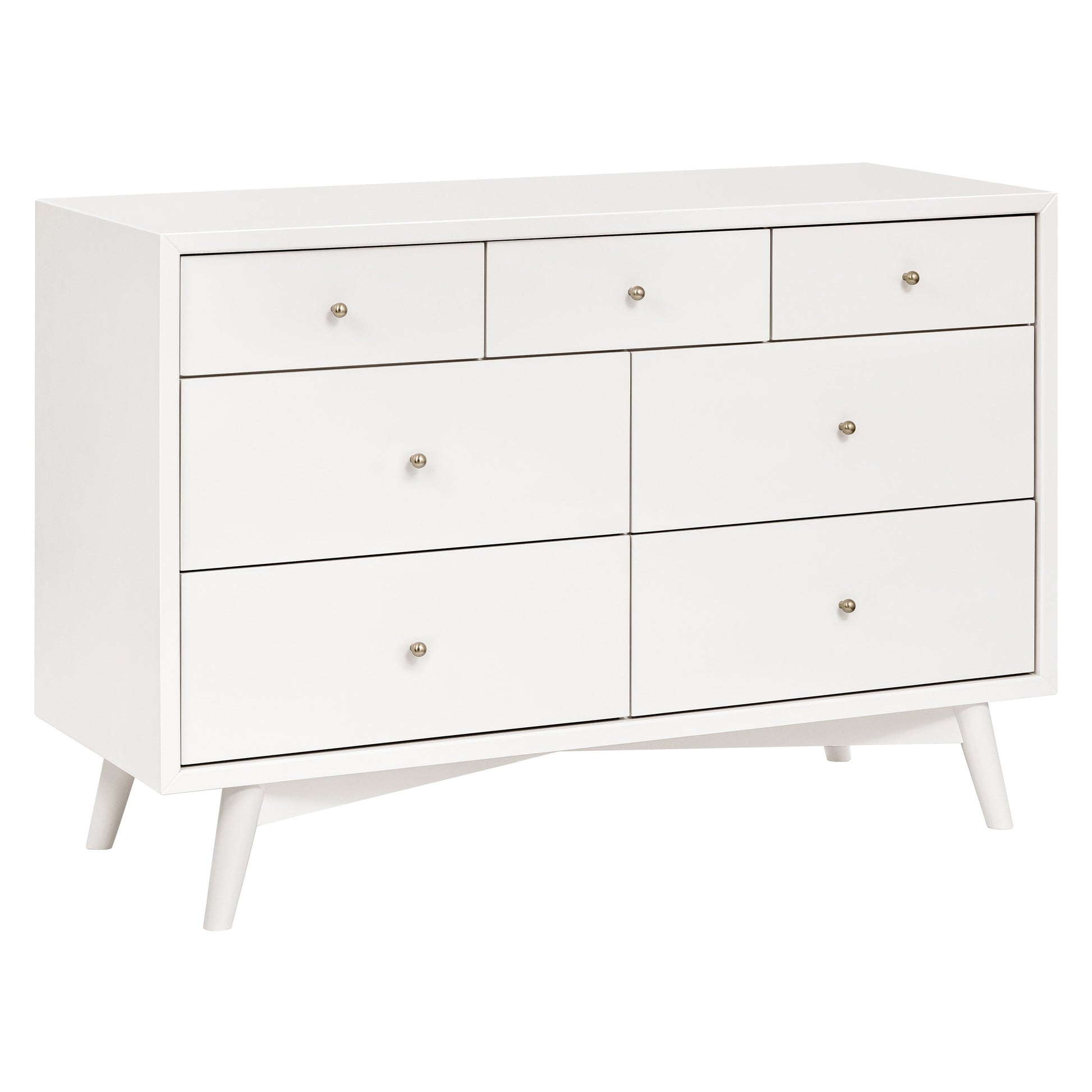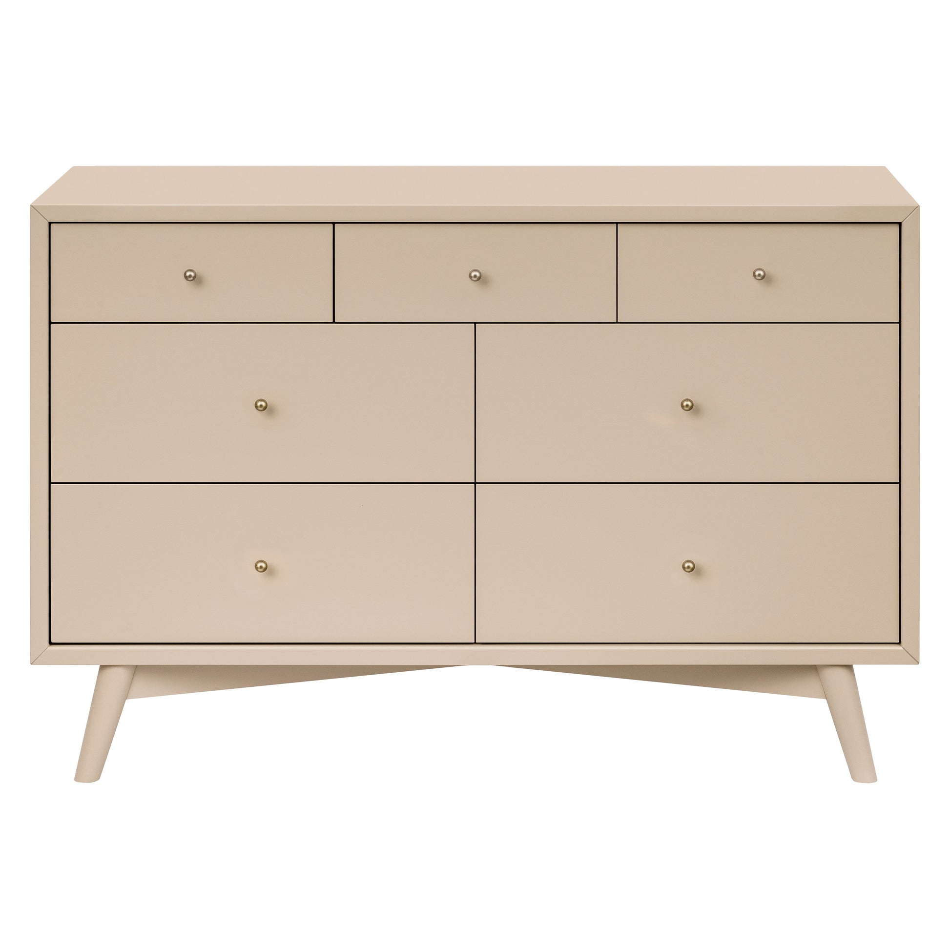 The Palma 7-drawer Double Dresser is a sophisticated mid-century inspired design with contrasting walnut stained drawers, tapered legs, brushed metal hardware, and smooth-glide drawers. It's a versatile modern piece, providing ample storage space with three top drawers and four larger bottom drawers. Pair with the Palma 4-in-1 Crib or Peggy 3-in-1 Crib for an elegant nursery.