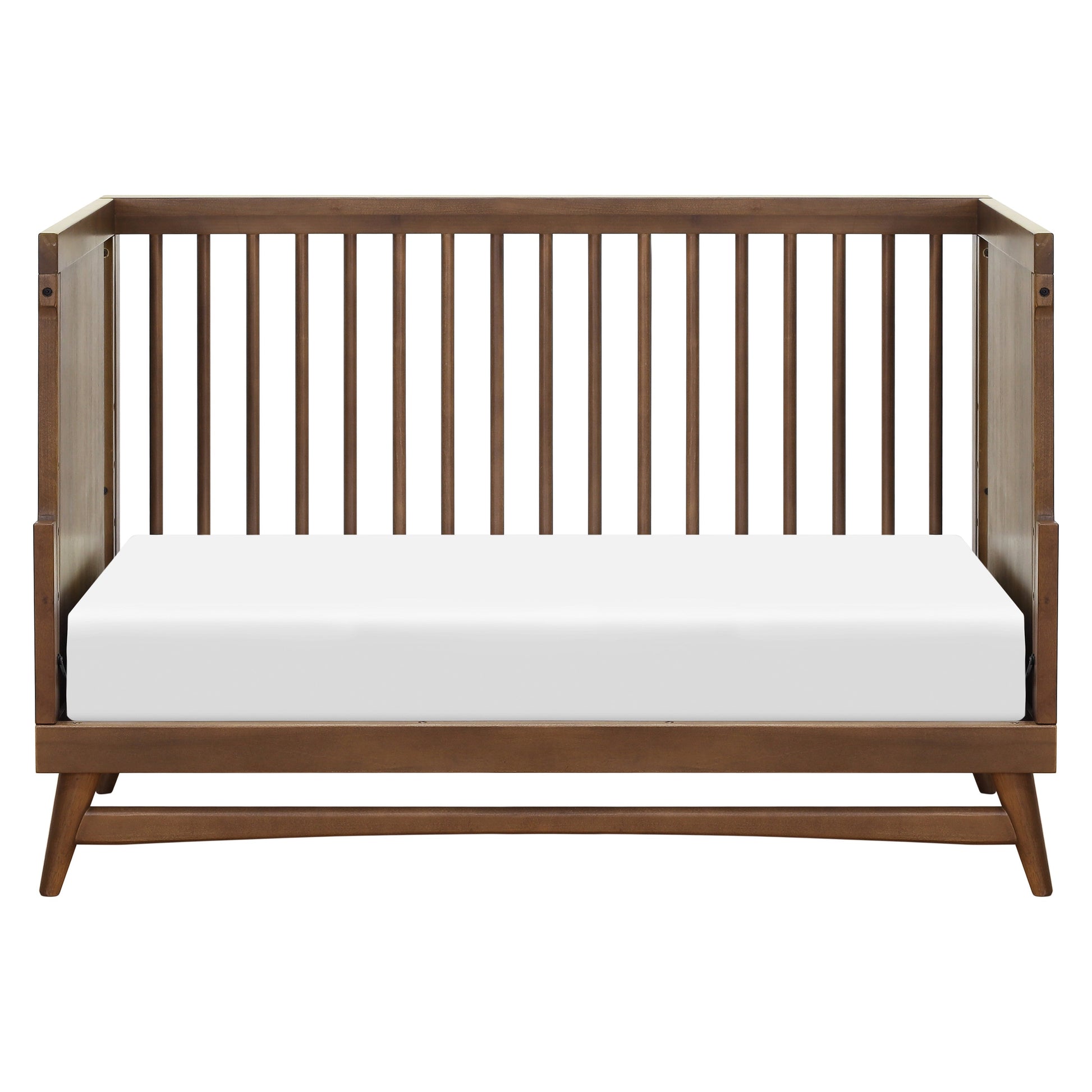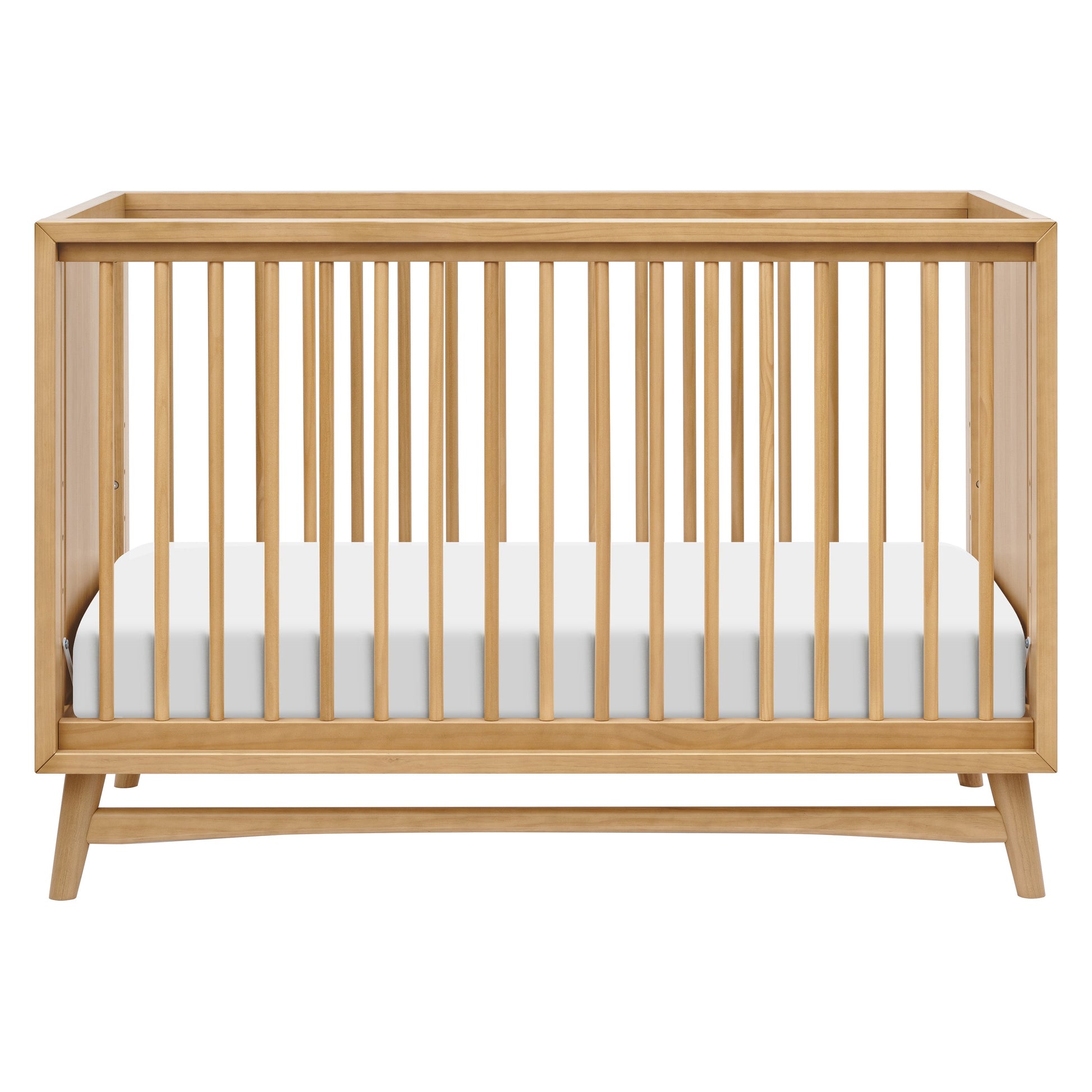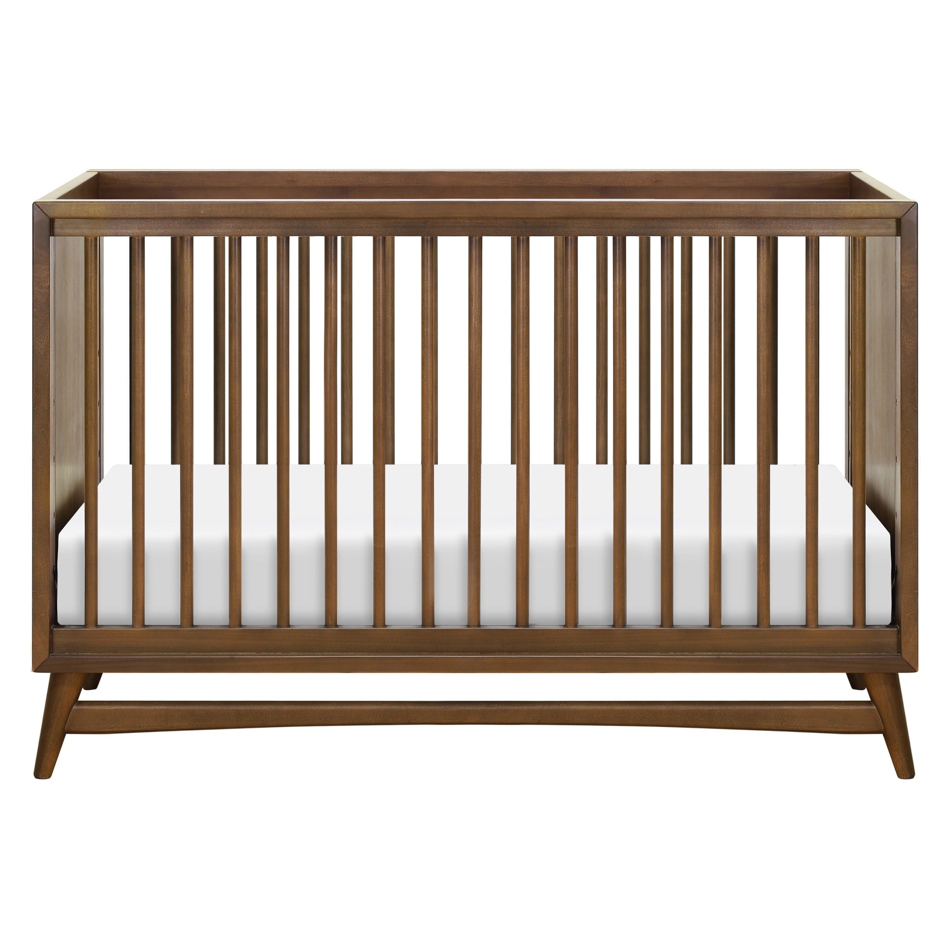 - REFINED MID-CENTURY MODERN STYLE: Featuring a modern, clean silhouette and classic rounded spindles. Flared tapered legs add a playful touch to this sophisticated crib.