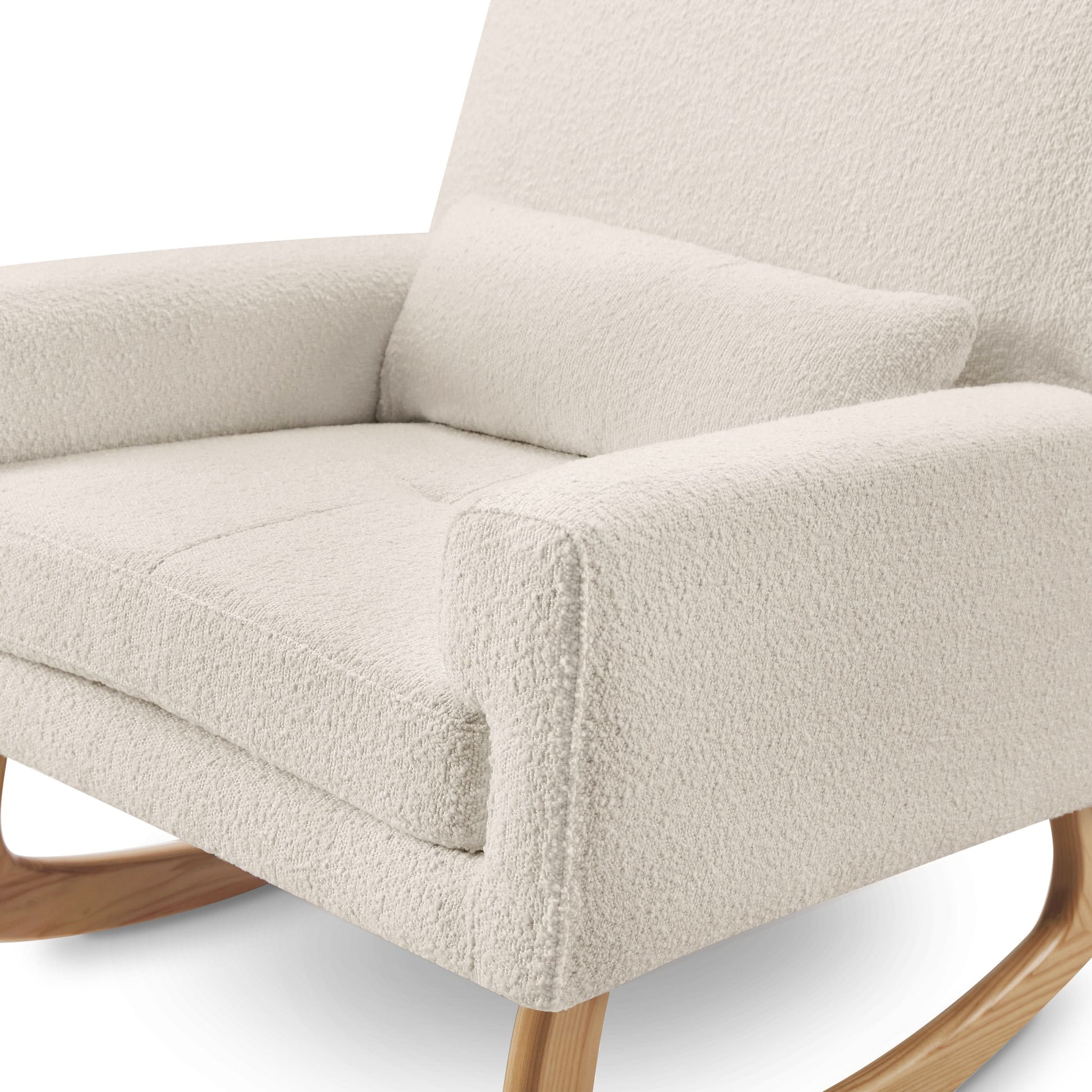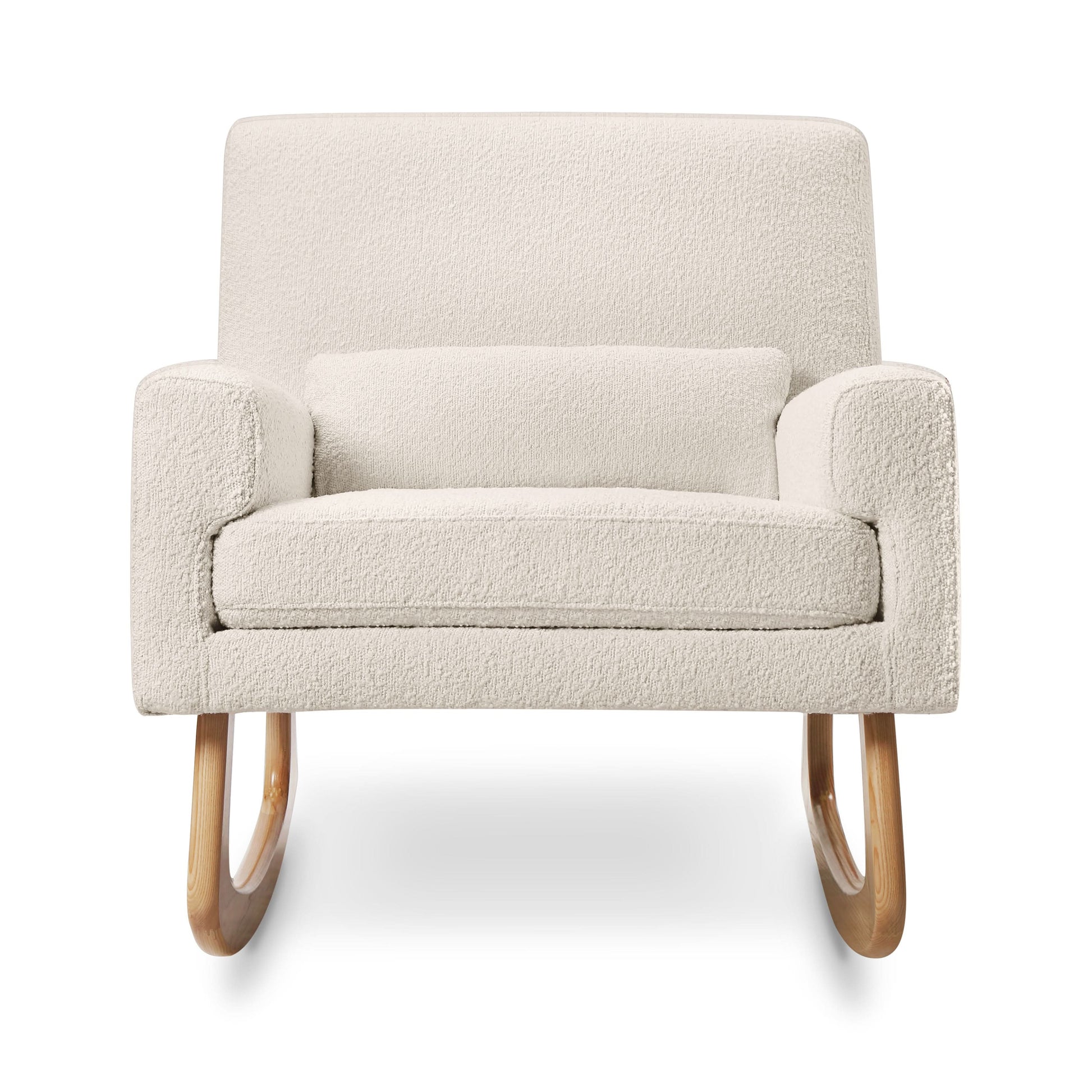 The well-balanced Sleepytime Rocker is lightly padded and finely upholstered with a fitted back using a subtly textured boucle fabric. Ash hardwood legs allow for a smooth rocking motion.