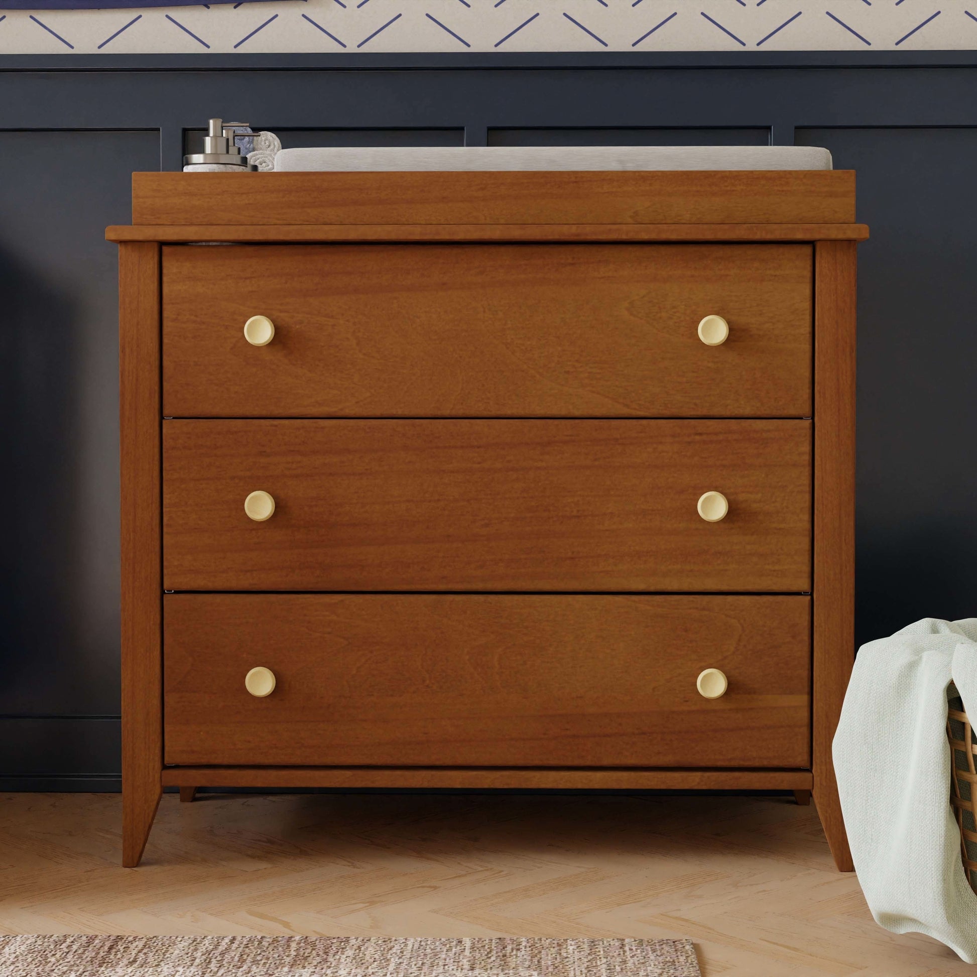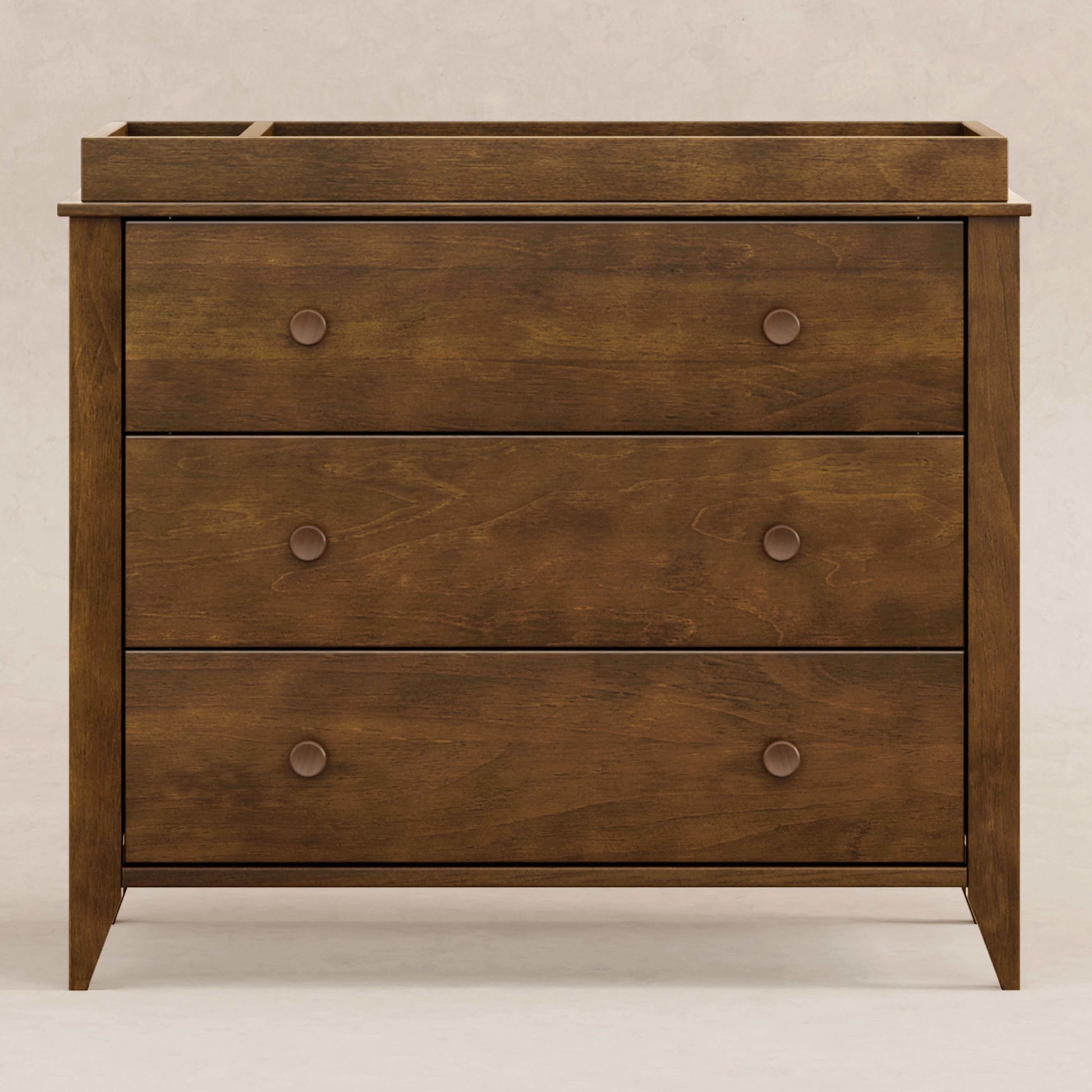 Mid-century modern, meet craftsman charm in the babyletto Sprout 3-drawer Changer Dresser. Versatile in design and function, this dresser seamlessly moves from the nursery to a big kid room. A removable changer top with a sectioned tray keeps those diaper-changing supplies within reach. Three spacious, smooth-glide drawers provide ample space for a growing babe’s wardrobe. Pair it with the Sprout 4-in-1 Convertible Crib for a classic mid-century modern nursery.