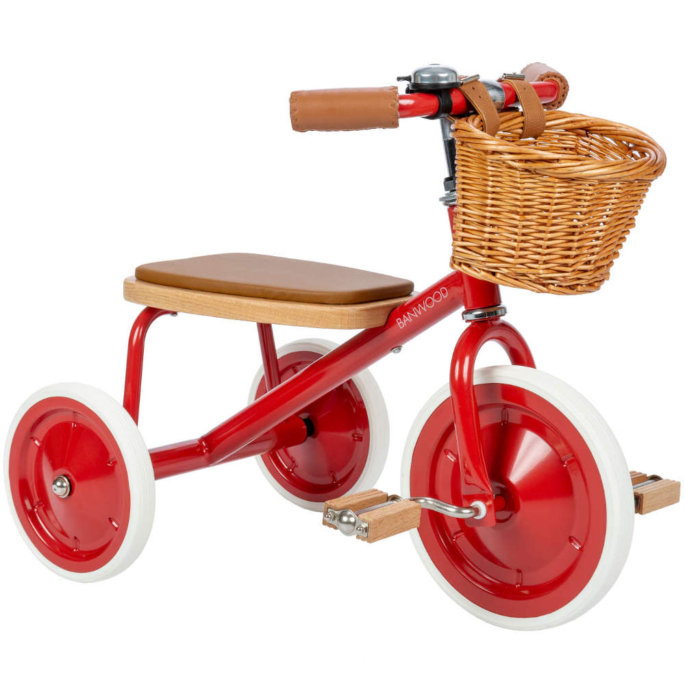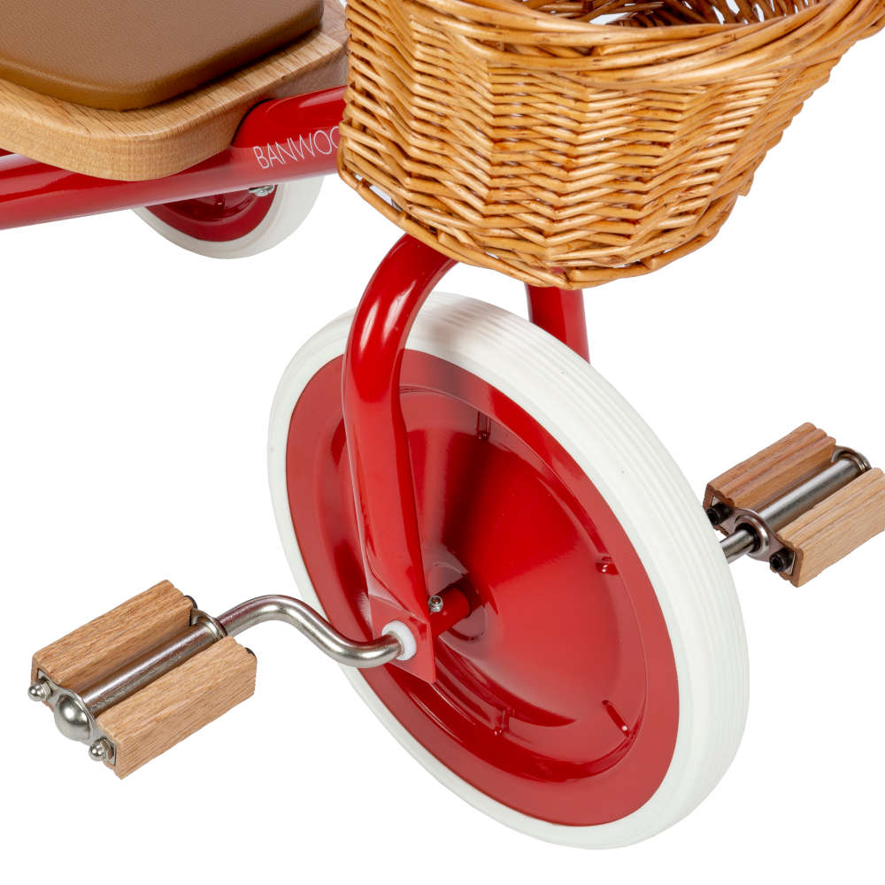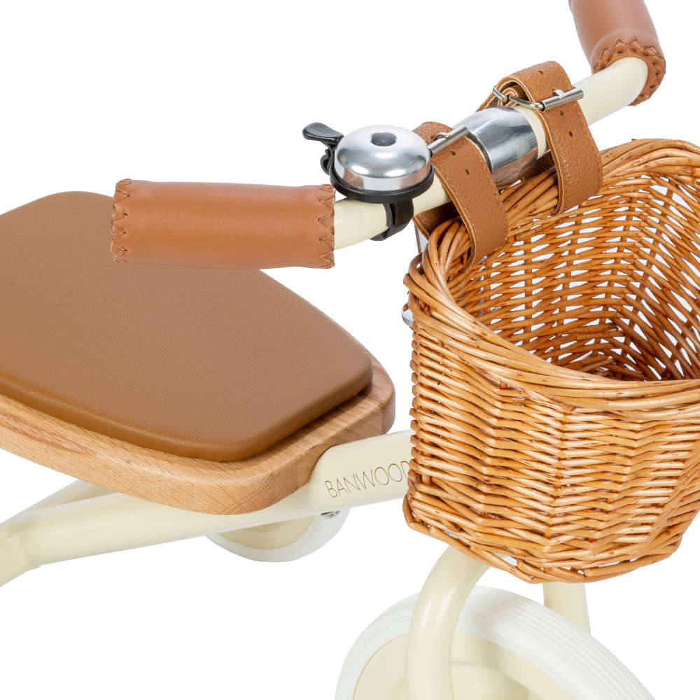 Featuring a soft padded oak seat, vegan leather details, wooden oak pedals and a cute wicker basket in front for bringing along their favorite toys