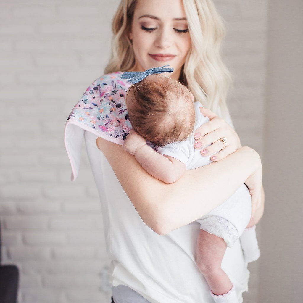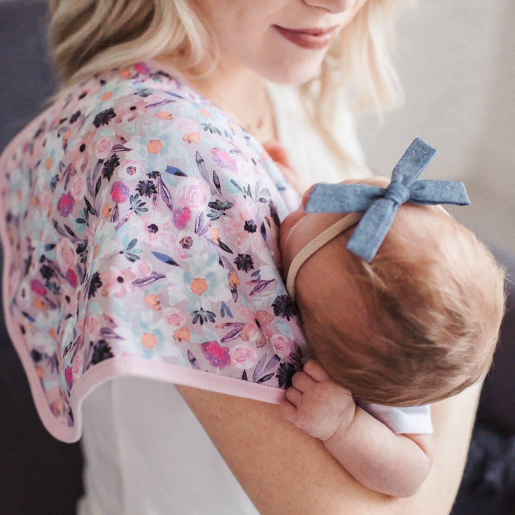 Copper Pearl's burp cloths are designed with baby’s comfort in mind. That’s why we created them with 100% ultra-soft cotton layers on the front (patterned) and back (plain white). You can feel confident that baby will feel cozy against your shoulder while burping.