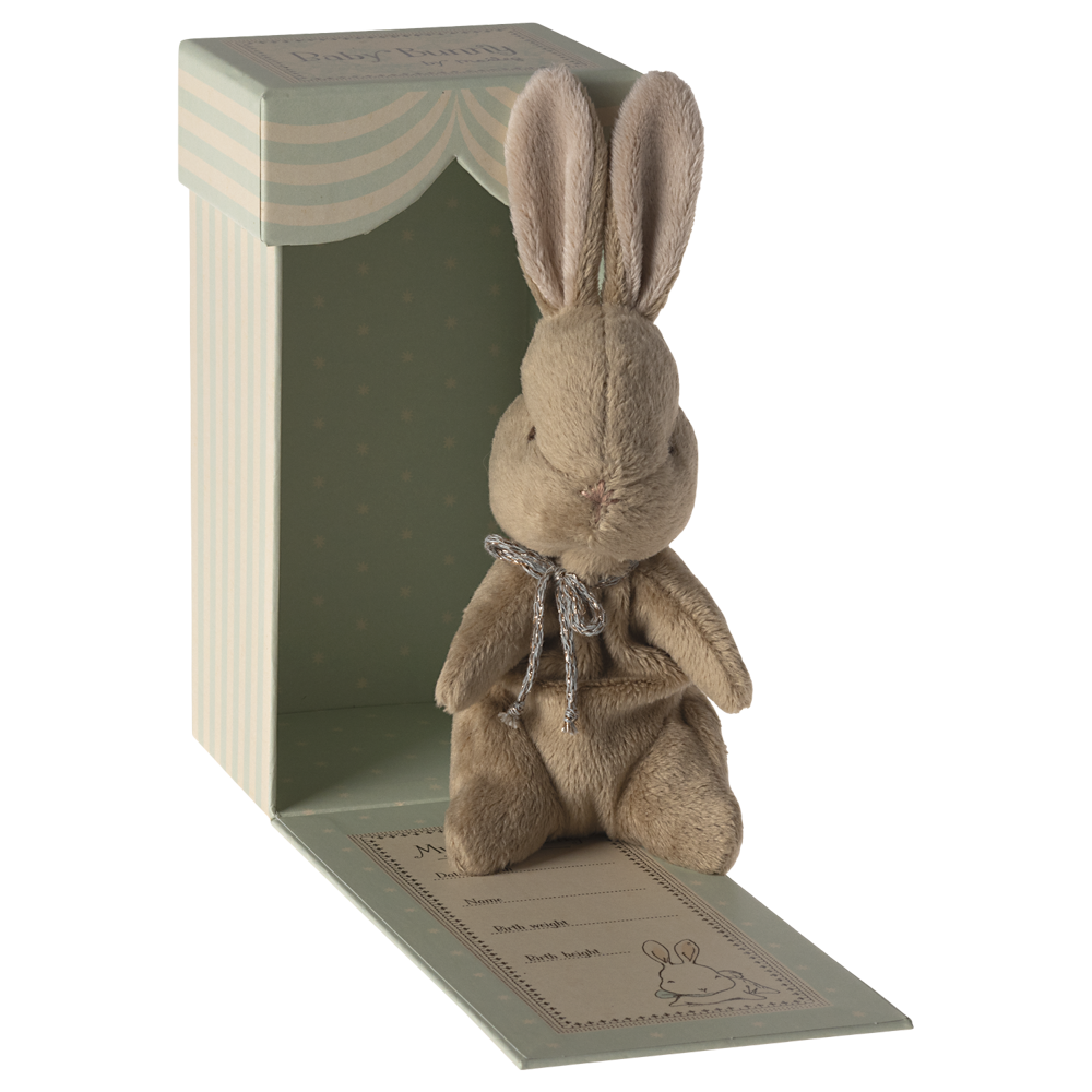 My first bunny is perfect for small hands. It is made in a soft plush quality and has a colored ribbon around the neck. It comes in a beautiful gift box, inside you can add the birth information.