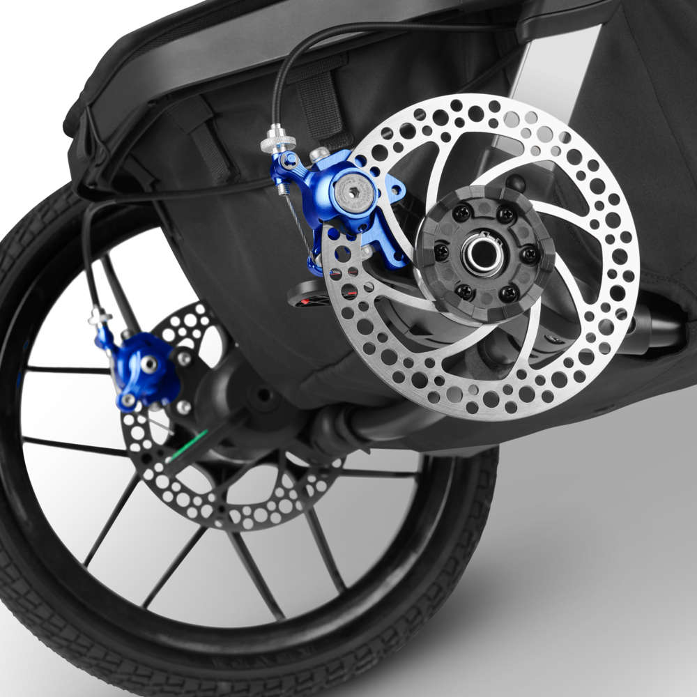 Unlike traditional drum hand brakes, the disc brakes provide greater performance and responsiveness to slow you down while running, going over rough terrain or walking downhill